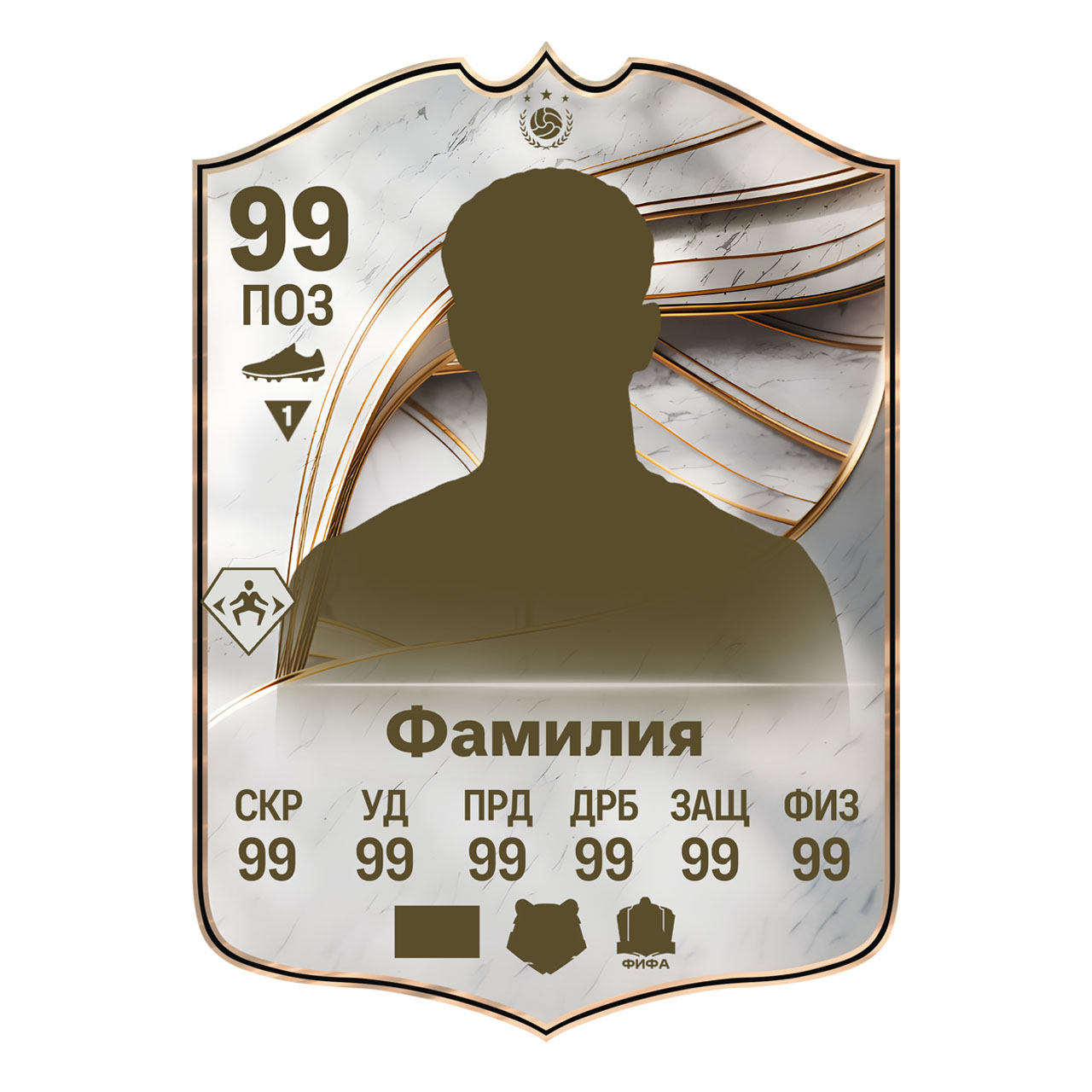Дизайн карточки ICON — это мраморный фон с утонченными золотыми орнаментами, придающими ощущение величия и легендарности. Вид также включает абстрактные линии или символы, похожие на «глаз», что подчёркивает мифический статус этих игроков.